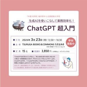 ちえなみきトップページ》嶺南教室チラシ-02 嶺南教室チラシ-02 2026.02.21 トップに戻る 前の記事 》 関連記事 お知らせ 2025.08.23 スタッフ募集のお知らせ お知らせ アナウンス 2025.11.01 2026年の休業日について お知らせ 2024.02.26 3月営業日について お知らせ イベントレポート 2023.08.05 7月のイベントレポート更新のお知らせ お知らせ イベントレポート 2023.07.01 6月のイベントレポート更新のお知らせ イベント情報 施設や周辺のイベント情報をお届けします。 NEW 開催予告 2026.02.21 3月21日(土) 敦賀ちえなみき大学<第1回> NEW 開催予告 2026.02.21 3月のイベント一覧はこちら NEW 開催予告 2026.02.21 3月8日(日) 科学者を虜にしたプラズマの輝き 丸善雄松堂は敦賀市と包括的地域連携協定を締結しました。 市民の皆さまに、全国の大学のオンライン講座を通じて“新しい知識”をご提供いたします! イベント情報をもっと見る 公式SNS