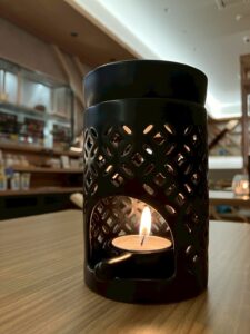 中道源蔵茶舗のテーブルにて茶香炉が焚かれ、店内にお茶の良い香りが広がりました。