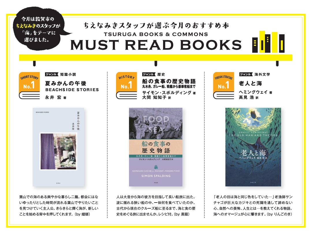 ちえなみきがお届けする 情報発信メディアです。 ちえなみきがお届けする 情報発信メディアです。 ちえなみきトップページ》ちえなみき通信》月刊誌「PALET」2025.7月号「スタッフが選ぶ今月のおすすめ本」にて書籍紹介 月刊誌「PALET」2025.7月号「スタッフが選ぶ今月のおすすめ本」にて書籍紹介 掲載 本 2026.04.06 「PALET」7月号掲載「ちえなみきスタッフおすすめ本」にて本の紹介をさせていただきました。 今回のテーマは「海」 ご紹介した本はこちら ©2025.6 PALET ぜひ本誌をお手に取り、読んでみてください。 《 次の記事 トップに戻る 前の記事 》 関連記事 2024.07.23 本人「強さとはなにか」 2024.05.29 【イベントレポート】クイリングワークショップ 2022.10.08 【開催報告】読書ノート作りワークショップ イベント情報 施設や周辺のイベント情報をお届けします。 NEW 開催予告 2026.03.20 特別企画『桃山鈴子のイモムシ原画展』 NEW 開催予告 2026.03.20 4月のイベント一覧はこちら NEW 開催予告 2026.03.20 4月18日(土) hapisuke毛糸くらぶ 丸善雄松堂は敦賀市と包括的地域連携協定を締結しました。 市民の皆さまに、全国の大学のオンライン講座を通じて“新しい知識”をご提供いたします! イベント情報をもっと見る お知らせ ちえなみきからのお知らせです。 2025.11.01 2026年の休業日について 2026.03.06 第11回「本人」参加者募集のお知らせ 2026.01.24 1月24日(土)営業時間変更のお知らせ 2026.01.23 1月23日(金)営業時間変更のお知らせ 2026.01.22 大雪警報発令によるイベント中止のお知らせ 2025.11.01 年末年始の営業について お知らせをもっと見る 公式SNS
