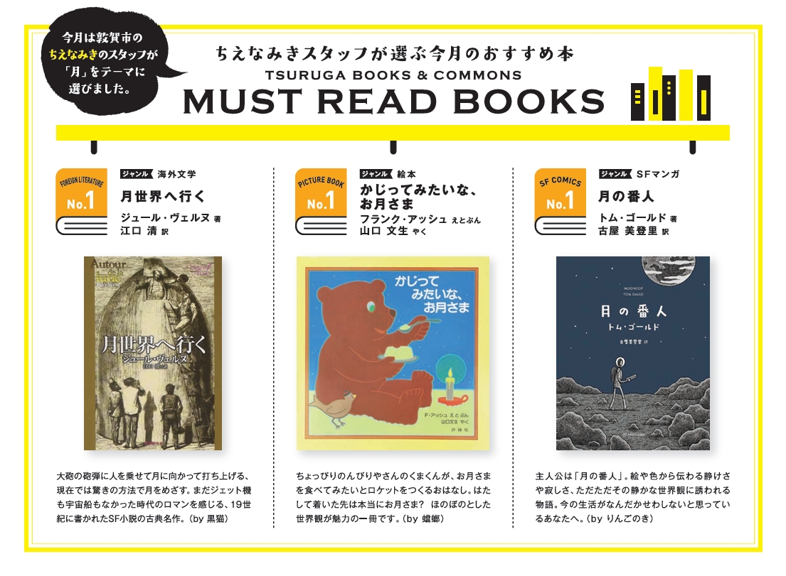 ちえなみきがお届けする 情報発信メディアです。 ちえなみきがお届けする 情報発信メディアです。 ちえなみきトップページ》ちえなみき通信》月刊誌「PALET」2025.9月号「スタッフが選ぶ今月のおすすめ本」にて書籍紹介 月刊誌「PALET」2025.9月号「スタッフが選ぶ今月のおすすめ本」にて書籍紹介 掲載 本 2026.04.06 「PALET」9月号掲載「ちえなみきスタッフおすすめ本」にて本の紹介をさせていただきました。 今回のテーマは「月」 ご紹介した本はこちら ©2025.8 ぜひ本誌をお手に取り、読んでみてください。 《 次の記事 トップに戻る 前の記事 》 関連記事 2023.10.07 【イベントレポート】Key Answerと謎解き勝負 2025.10.21 【イベントレポート】敦賀の歴史をこねる会~本当にこねるよ~ 2025.12.02 【イベントレポート】オリジナルカレンダーをつくろう イベント情報 施設や周辺のイベント情報をお届けします。 NEW 開催予告 2026.03.20 特別企画『桃山鈴子のイモムシ原画展』 NEW 開催予告 2026.03.20 4月のイベント一覧はこちら NEW 開催予告 2026.03.20 4月18日(土) hapisuke毛糸くらぶ 丸善雄松堂は敦賀市と包括的地域連携協定を締結しました。 市民の皆さまに、全国の大学のオンライン講座を通じて“新しい知識”をご提供いたします! イベント情報をもっと見る お知らせ ちえなみきからのお知らせです。 2025.11.01 2026年の休業日について 2026.03.06 第11回「本人」参加者募集のお知らせ 2026.01.24 1月24日(土)営業時間変更のお知らせ 2026.01.23 1月23日(金)営業時間変更のお知らせ 2026.01.22 大雪警報発令によるイベント中止のお知らせ 2025.11.01 年末年始の営業について お知らせをもっと見る 公式SNS