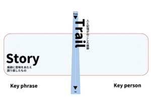 「敦賀ものがたり」の調査フォーマットです。縦軸が、人と記憶が残した痕跡(Trail)。横軸は、そこから語り直された意味(Story)になっています。