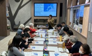 まとめの時間には、参加者一人ひとりが考える敦賀の「〇〇〇の道」を発表してもらいました。海産物の道、疋田舟川・運河の道、中国絵画の水引幕で神楽通りをゆく山車の道、深坂古道の史と詩の道、黒河川や町の井戸水など命の源としての水の道、大谷吉継と信仰の道、塩の道など、多様な視点が示されました。