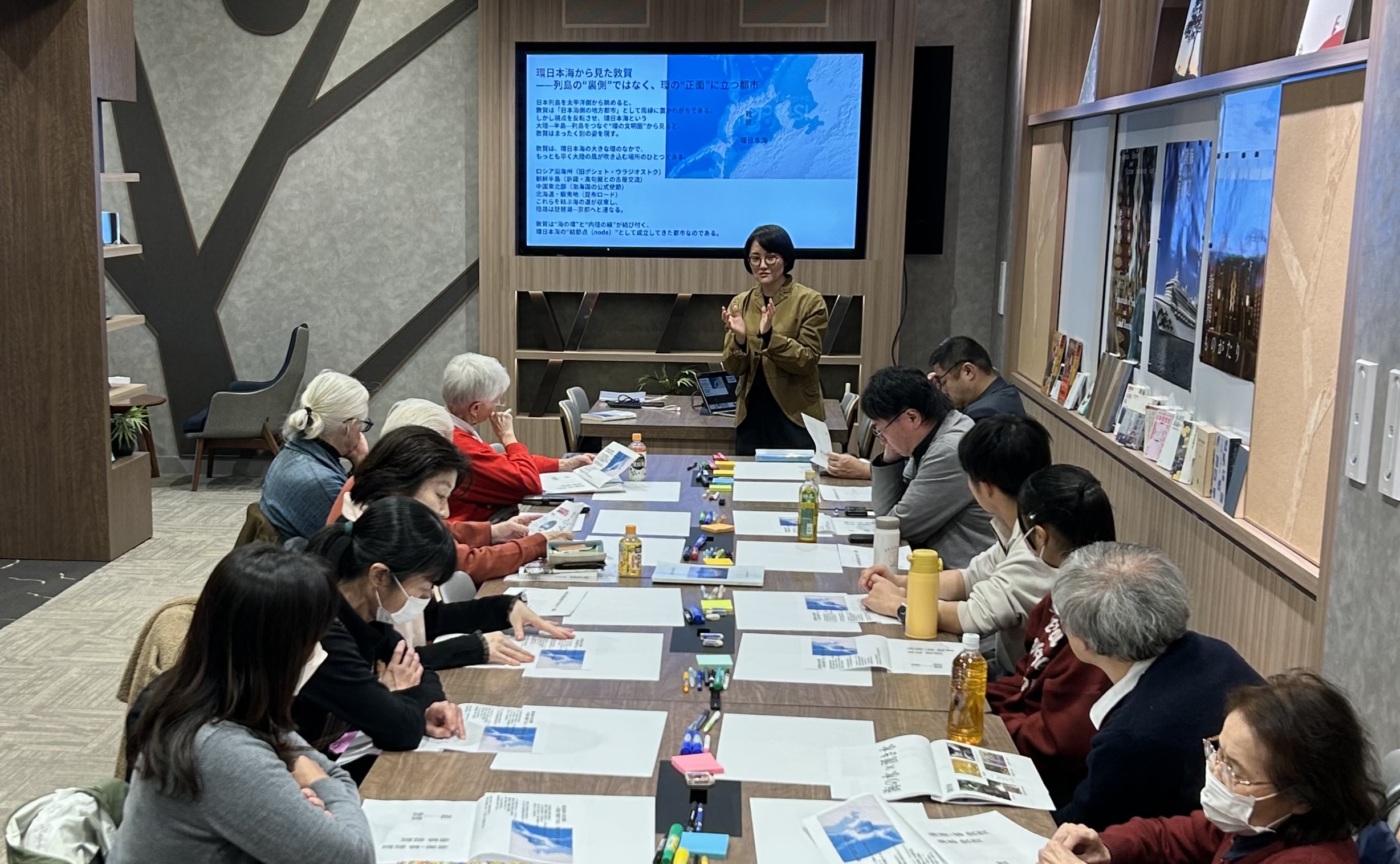 参加者は、市内の中学生や都内に進学した大学生、地元を牽引する企業人や教育者、ファシリテーターに加え、商店街のリーダー、活動歴50年となる気比史学会の重鎮、さらにはその縁で京都から参加した歴史文化の専門家や海外の有識者まで、世代や立場を超えた多様な顔ぶれとなりました。会場は、敦賀駅前にある書店「ちえなみき」。ナビゲーターは、本プロジェクトの企画構成を担う株式会社百間です。
